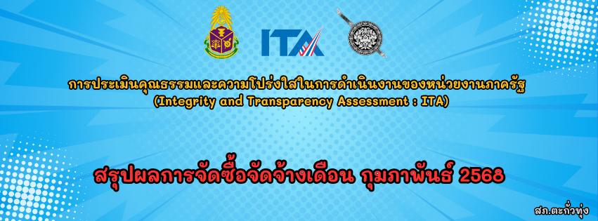 Home » ITA 2568 » การบริหารเงินงบประมาณ » การจัดซื้อจัดจ้างหรือการจัดหาพัสดุ » สรุปผลการจัดซื้อจัดจ้างรายเดือน » สรุปผลการจัดซื้อจัดจ้างเดือน กุมภาพันธ์ 2568